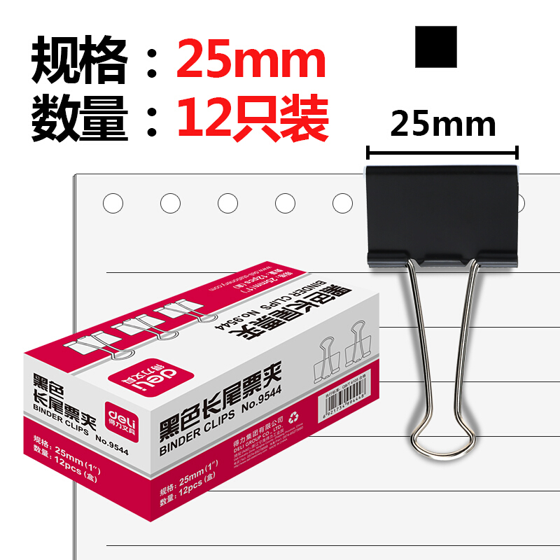 • 商品名称:得力 黑色长尾夹 25mm(12个/盒)
