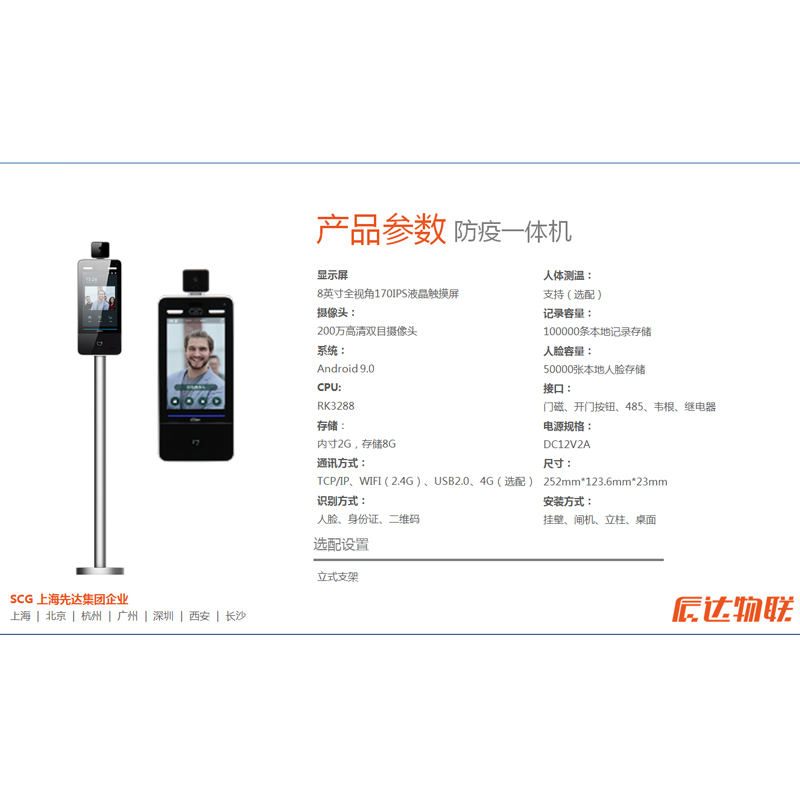 防疫一体机立柱支架(含测温/人证/扫码/人脸/支持4G、WIFI/语音播报) 8寸屏,安卓9.0,200万高清双目摄像头,2G+8G内存
