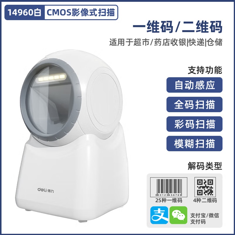 - 商品名称:得力14960扫描器扫描枪手机支付扫码盒子二维码平台扫码器 白色