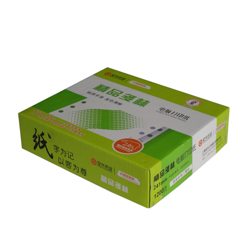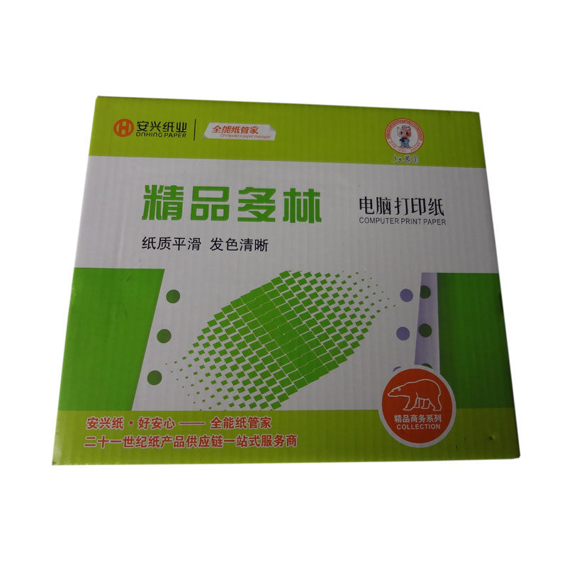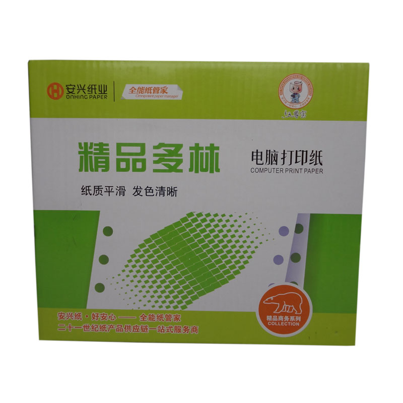 电脑打印纸采用优质双胶,无碳原纸,精工细作,平滑顺畅,发色清晰,品质稳定,产品型号除常规241mm,381mm(80列,132列)宽度外,另可根据客户要求订制多种规格产品,适用于各型号针式打印机。 精品多林:纸质平滑,发色清晰。