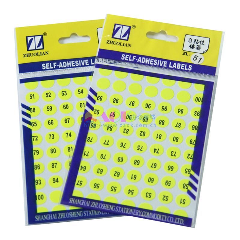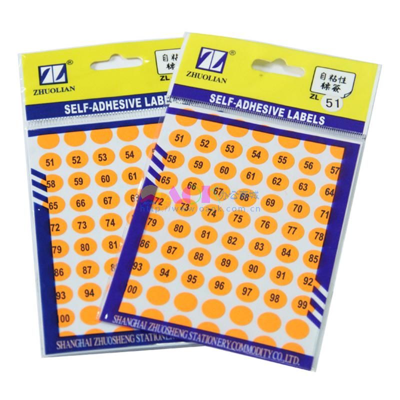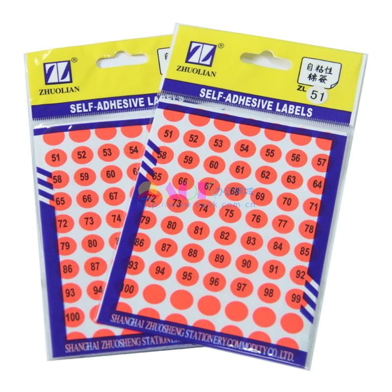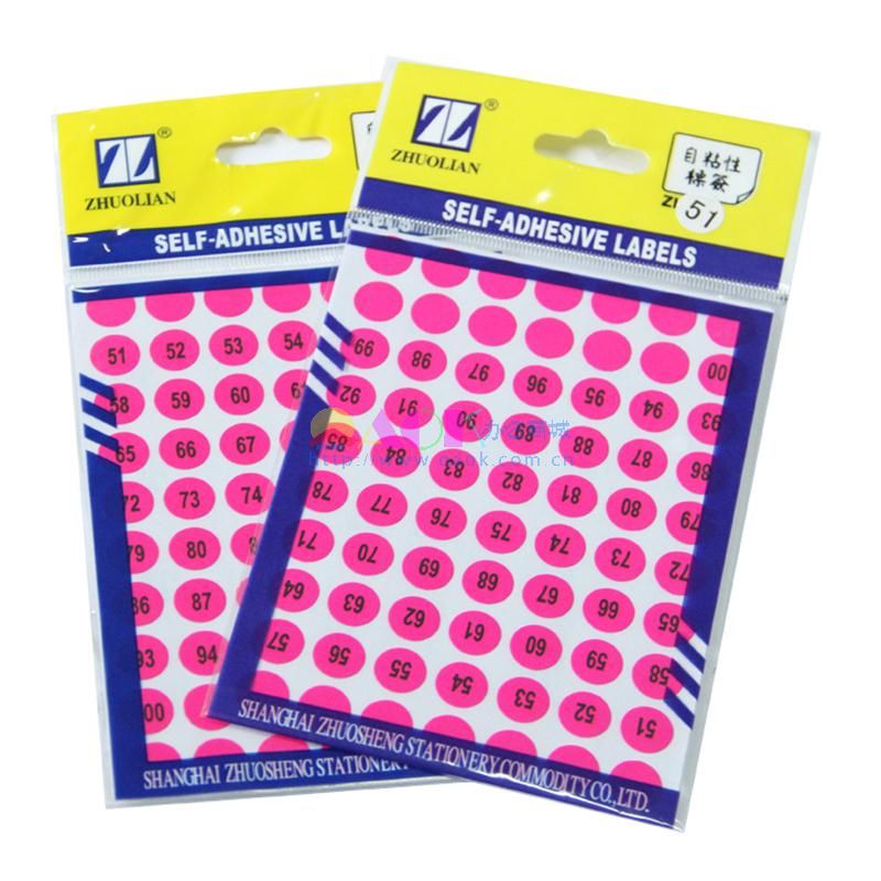 - 商品名称:卓联 ZL51 自粘性标签直径10mm 荧光(数字51-100)70*6张/本