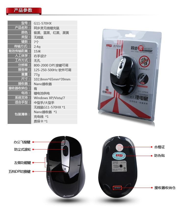 - 商品名称:双飞燕 A4Tech G11-570HX 充电无线鼠标 银黑