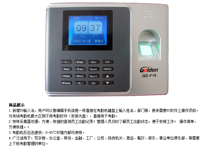 金典 (Golden) GD-F18 考勤机 新增T9输入法,用户可以像编辑手机信息一样直接在考勤机键盘上输入姓名、部门等,原来需要PC软件上操作项目。与传统考勤机最大区别不用考勤软件(安装光盘),直接用于考勤。