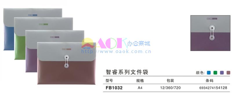 FB1032产品规格为:A4,颜色:蓝色、绿色、紫色、红色;包装为:12个/小盒,360个/大盒,720个/箱。