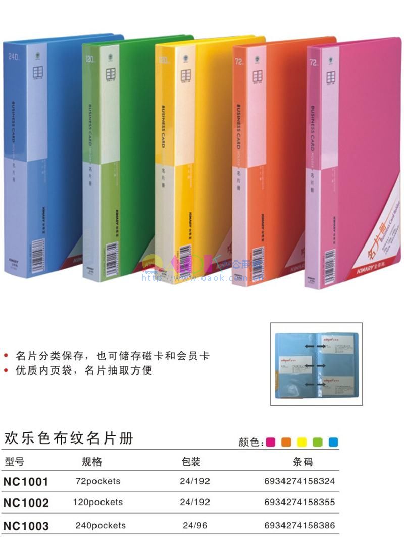 产品规格均为:尺寸:110×190mm;NC1001容量为:72张;产品颜色分别为:蓝色、绿色、橙色、红色、黄色;NC1001、NC1002均为产品包装为:24个/中盒,192个/大盒