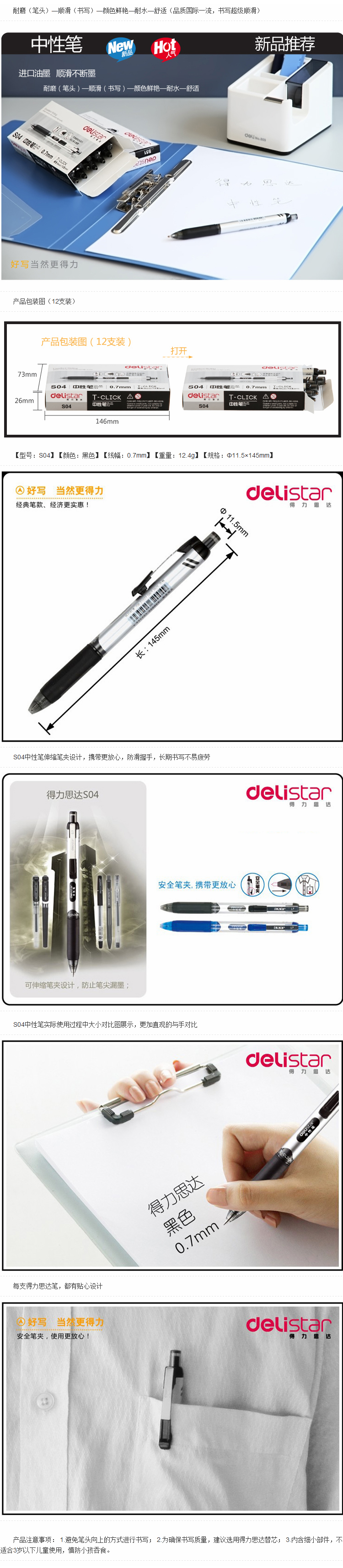 - 商品名称:得力S04安全笔夹防滑握手按动式中性笔 0.7mm<蓝色>