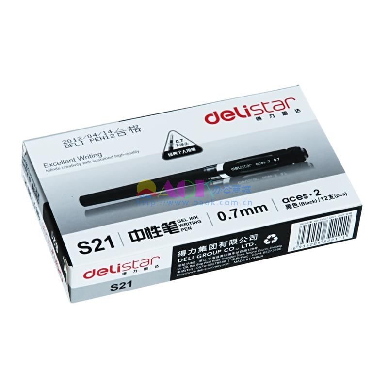 ┃颜色:黑色┃规格:0.7┃包装:12/144/1728┃外箱尺寸:54.5×32×38cm┃耐磨(笔头)—顺滑(书写)—颜色鲜艳—耐水—舒适—0┃7子弹头┃磨砂笔杆,柔软舒适┃0┃7子弹头,经典个人用笔┃每支得力思达笔,都有贴心设计┃品质国际一流,书写超级顺滑